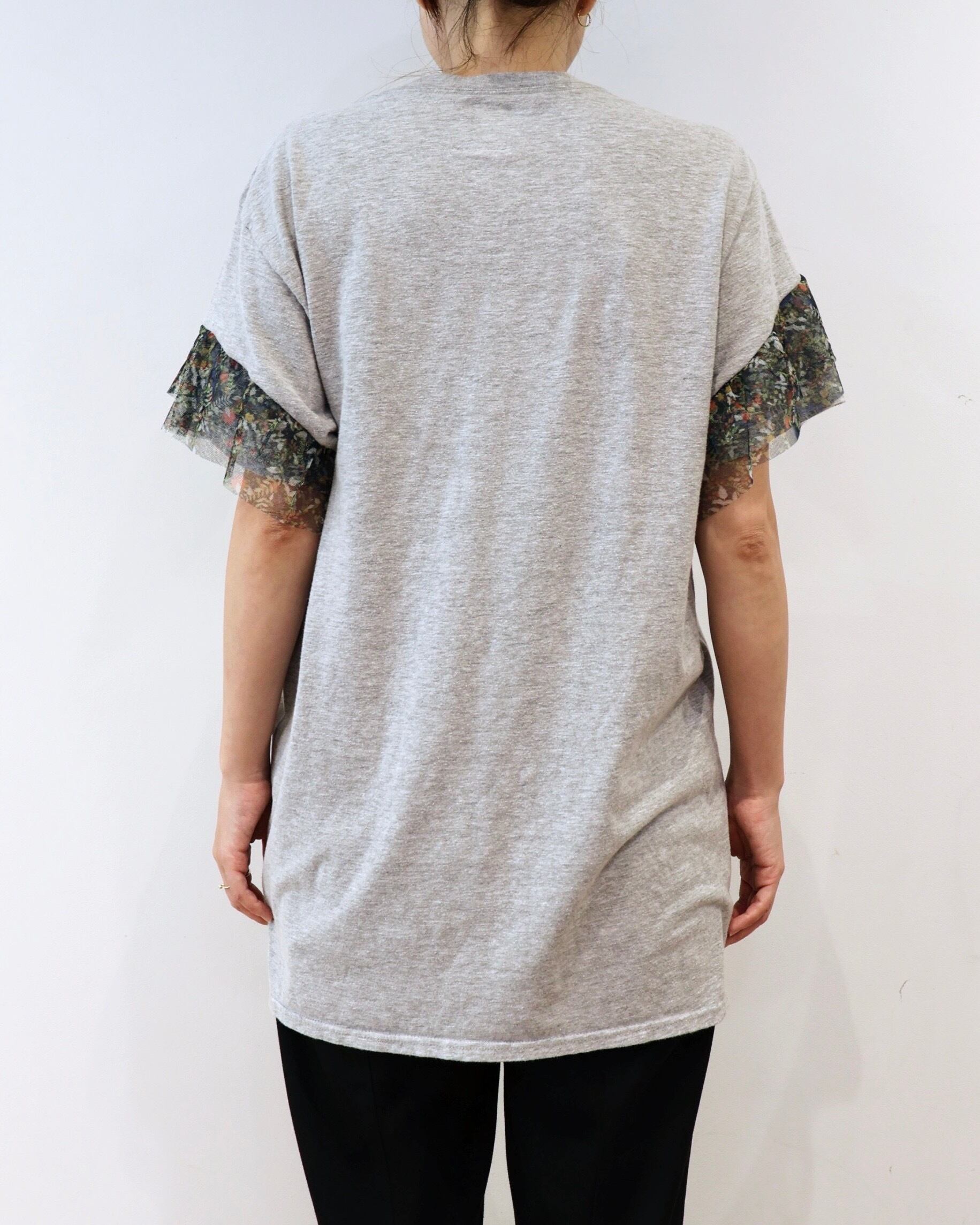 リバティプリントのメッシュ生地が胸元から袖にフリルで